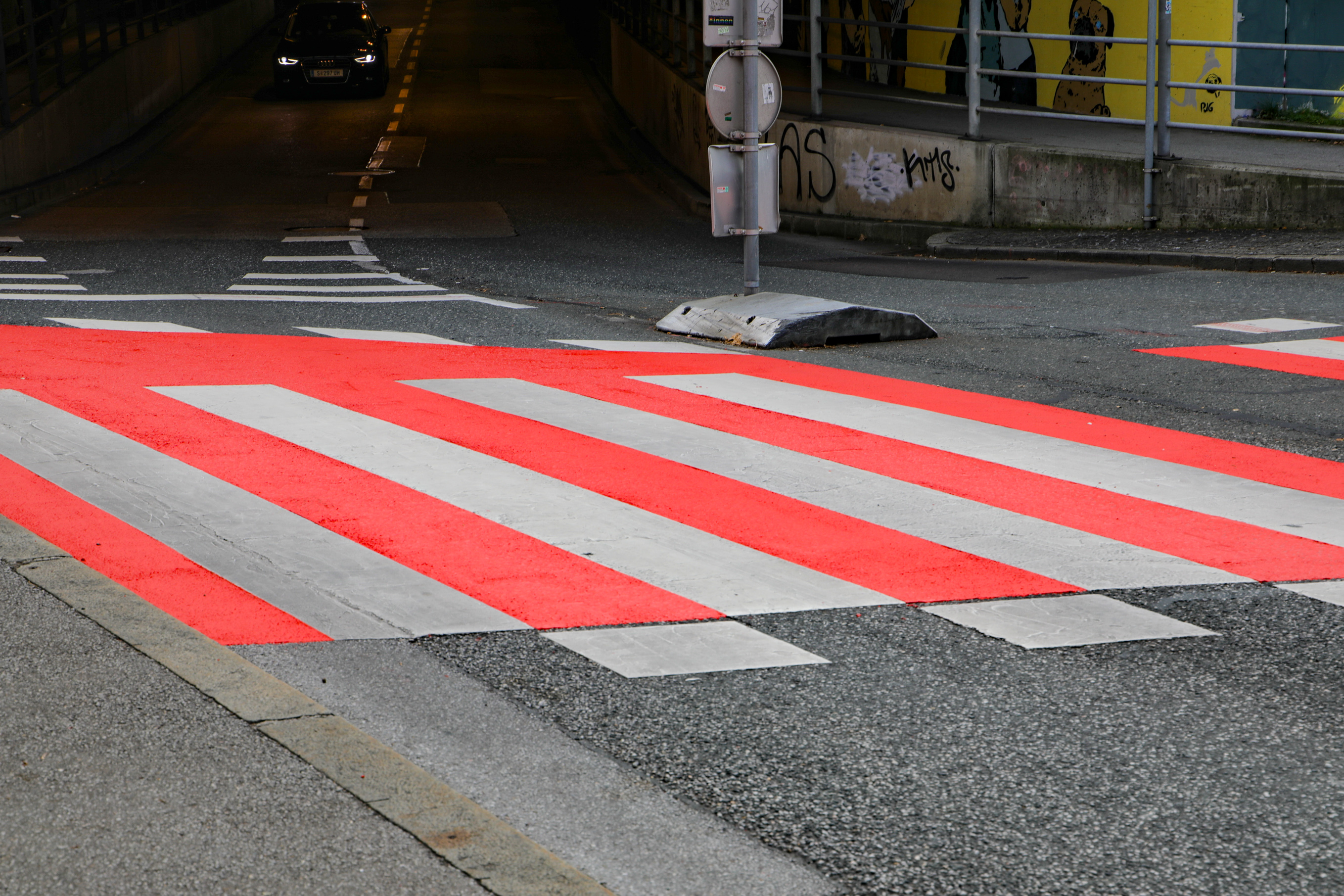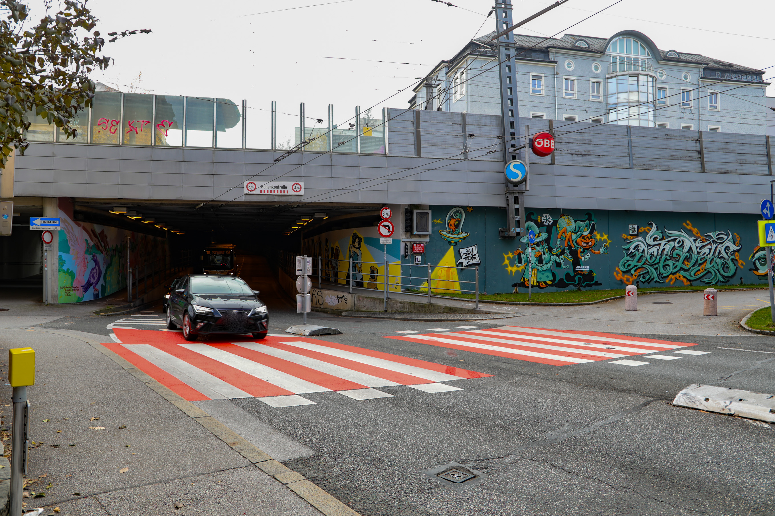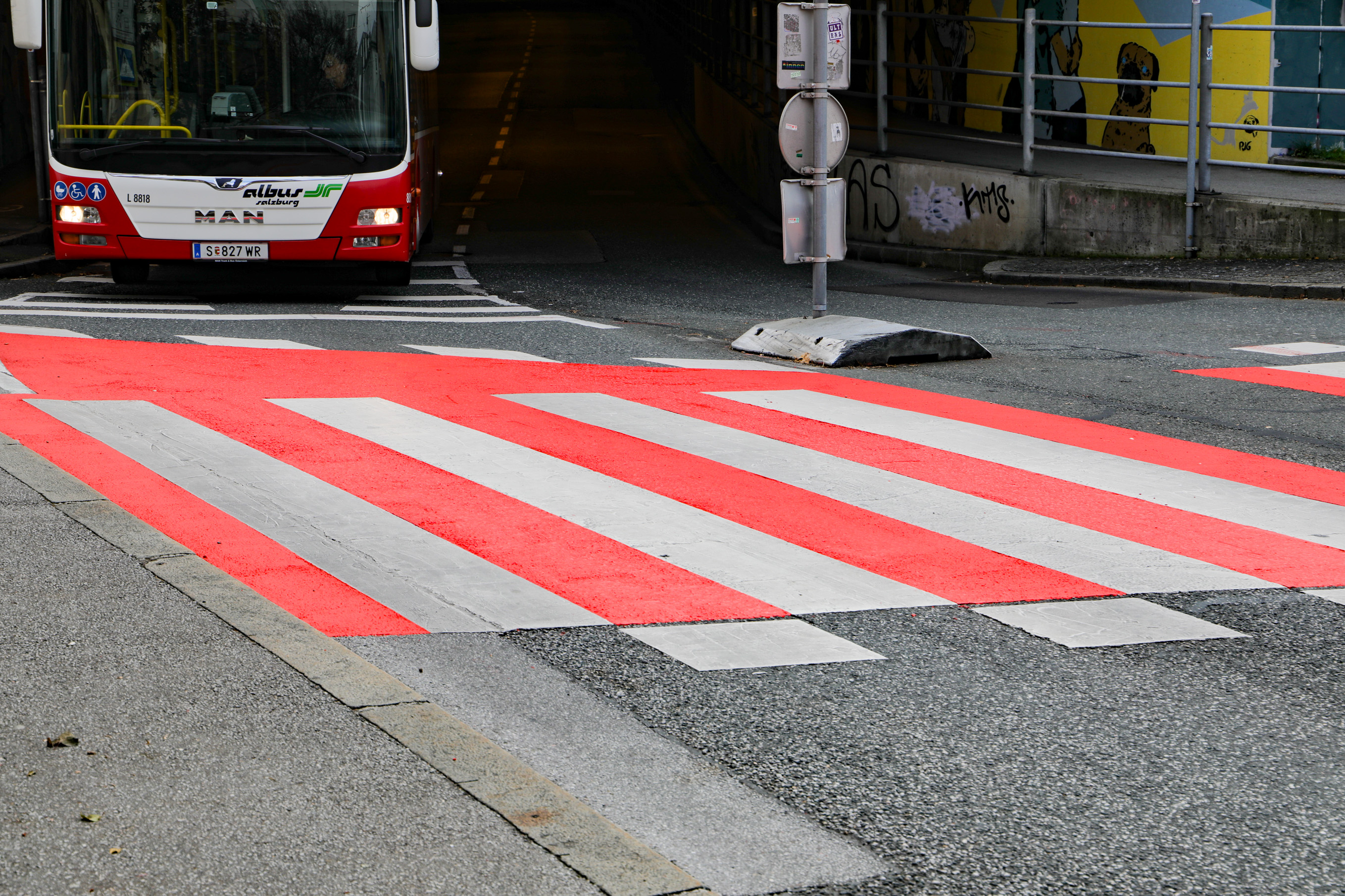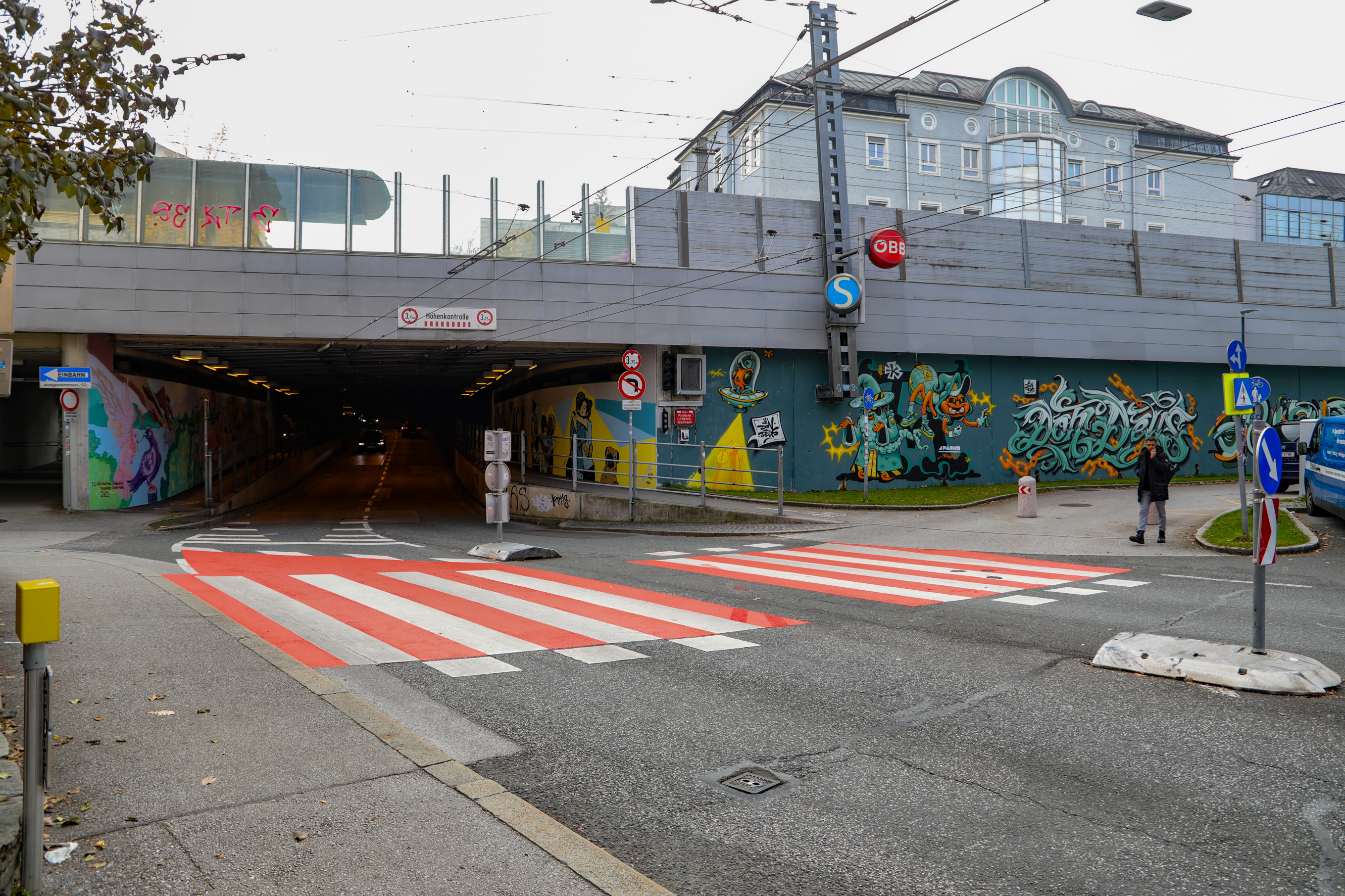 Um das Nadelöhr bei der Unterführung der Gaswerkgasse (LKH-Tunnel) in der Stadt Salzburg in Richtung Landeskrankenhaus zu entschärfen, plant das städtische Straßen- und Brückenamt derzeit mehrere Varianten. Eine davon ist eine Brücke über die Gefahrenstelle. Zuerst wurde aber als erst Maßnahme eine grelle Orange-Rote Markierung auf den Fuß und Radwegübergang aufgetragen. Diese soll die Autofahrer auf die Gefahrenstelle hinweisen. Was augenscheinlich auch funktionier. Schon von weitem ist der Fuß und Radübergang zu sehen. Besonders wenn man aus dem Tunnel fähr.