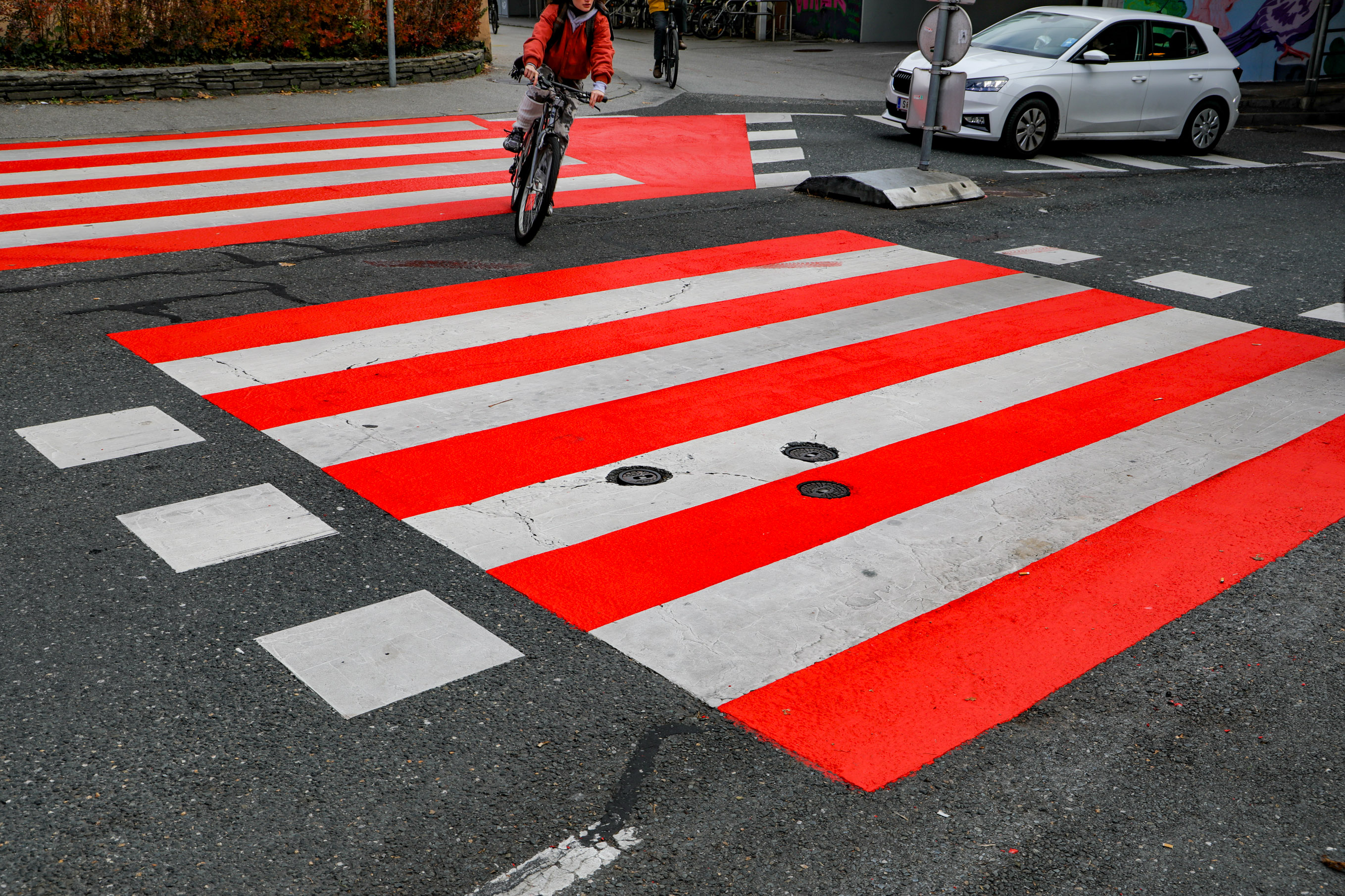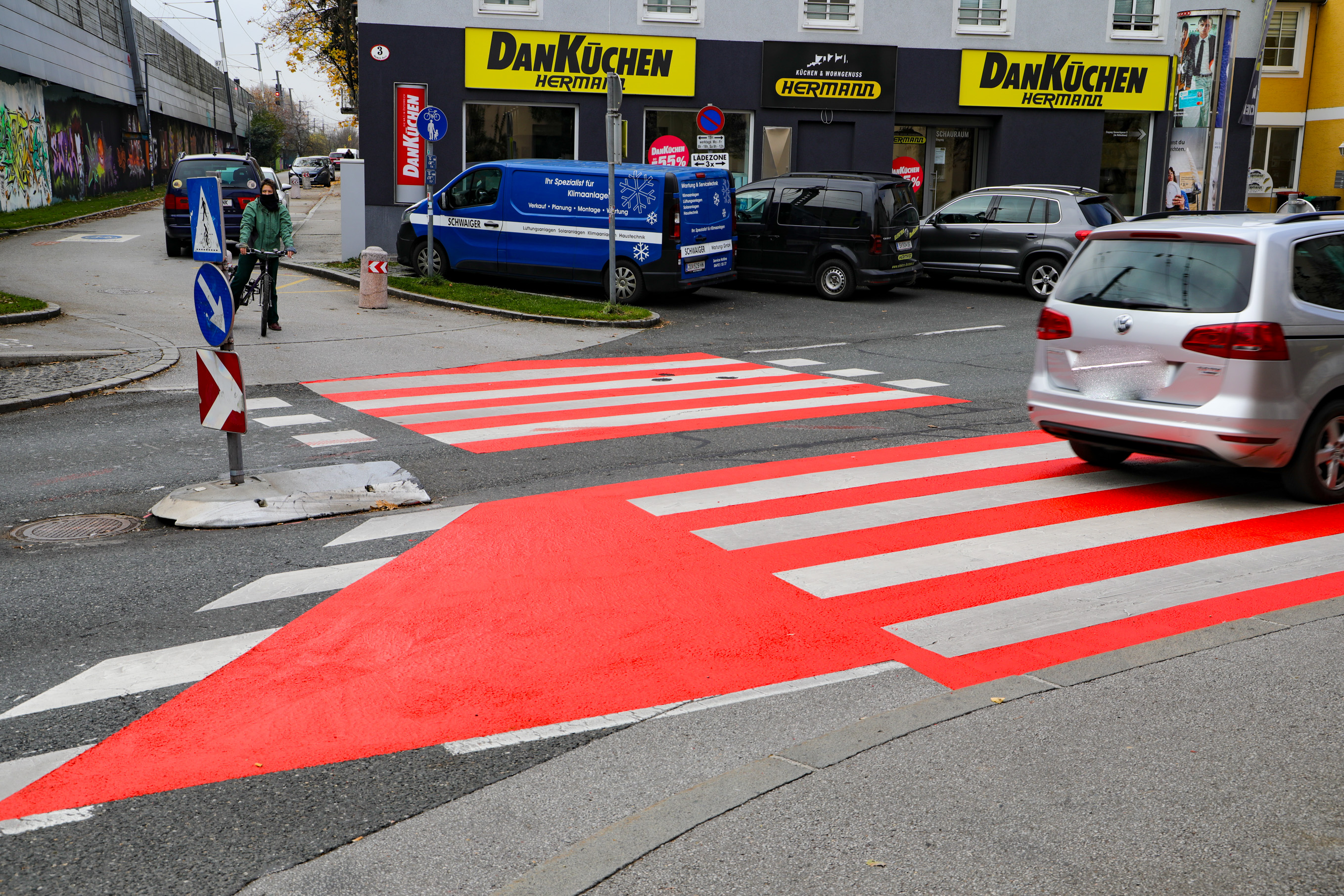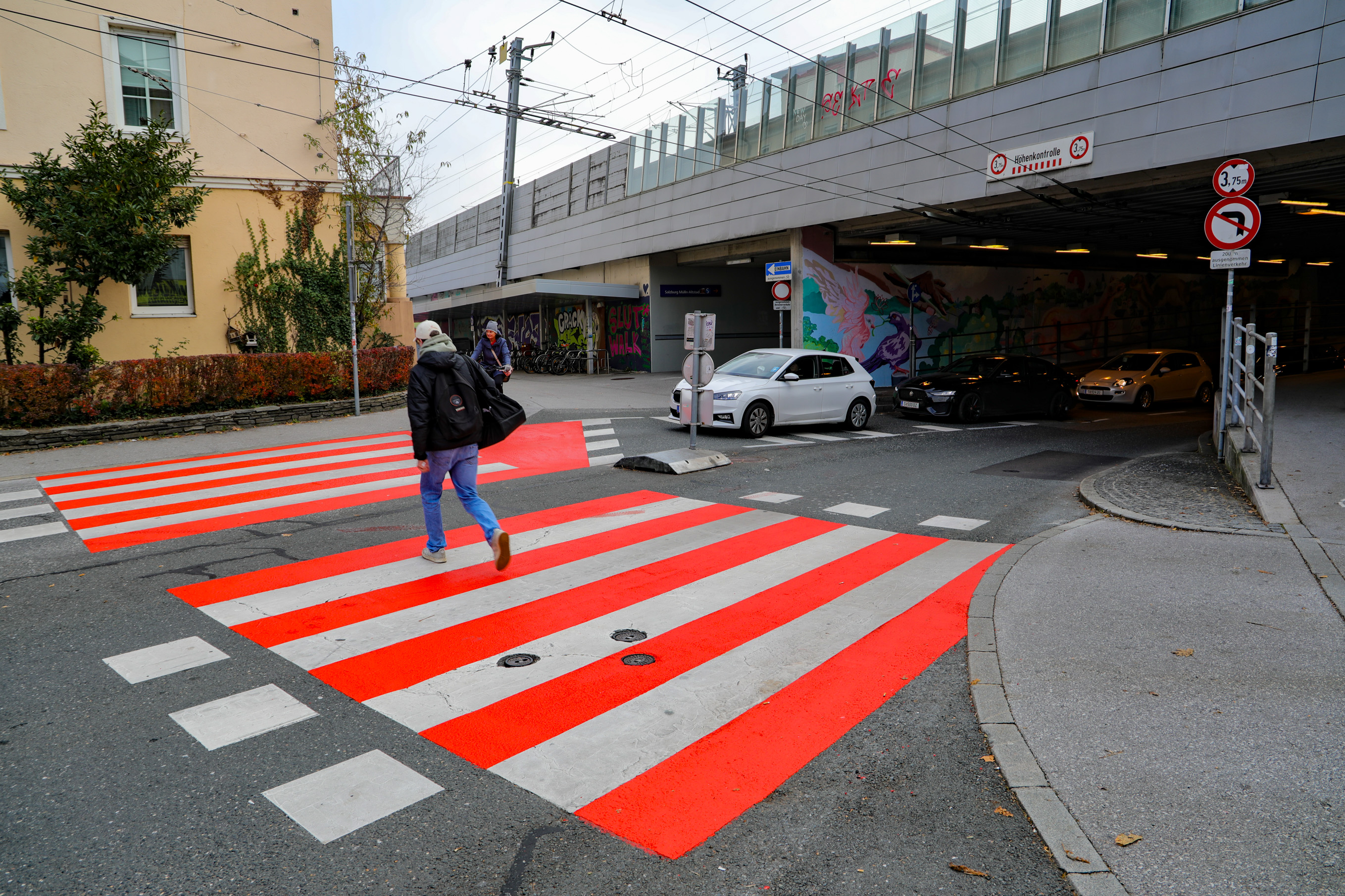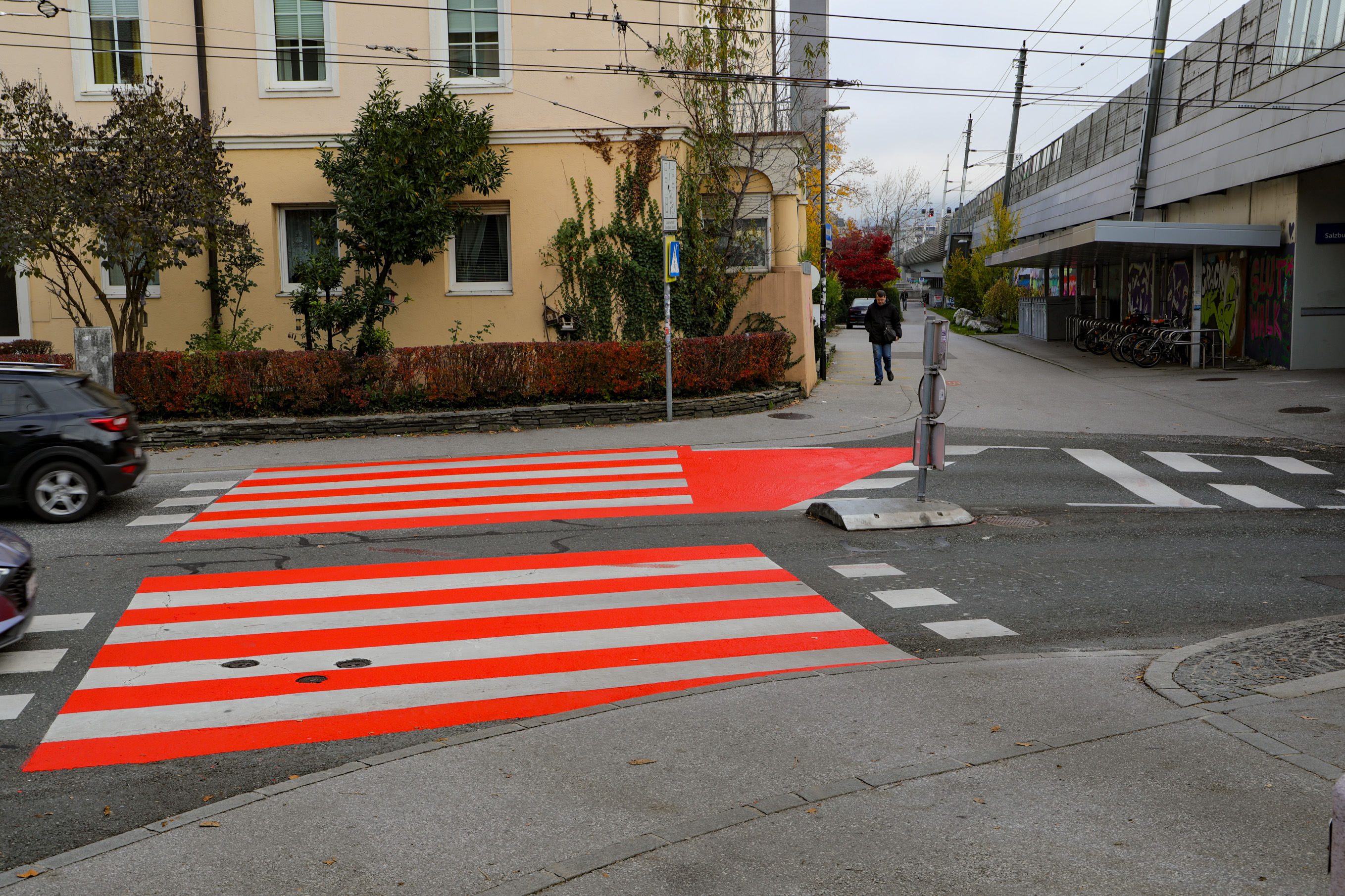 Um das Nadelöhr bei der Unterführung der Gaswerkgasse (LKH-Tunnel) in der Stadt Salzburg in Richtung Landeskrankenhaus zu entschärfen, plant das städtische Straßen- und Brückenamt derzeit mehrere Varianten. Eine davon ist eine Brücke über die Gefahrenstelle. Zuerst wurde aber als erst Maßnahme eine grelle Orange-Rote Markierung auf den Fuß und Radwegübergang aufgetragen. Diese soll die Autofahrer auf die Gefahrenstelle hinweisen. Was augenscheinlich auch funktionier. Schon von weitem ist der Fuß und Radübergang zu sehen. Besonders wenn man aus dem Tunnel fähr.