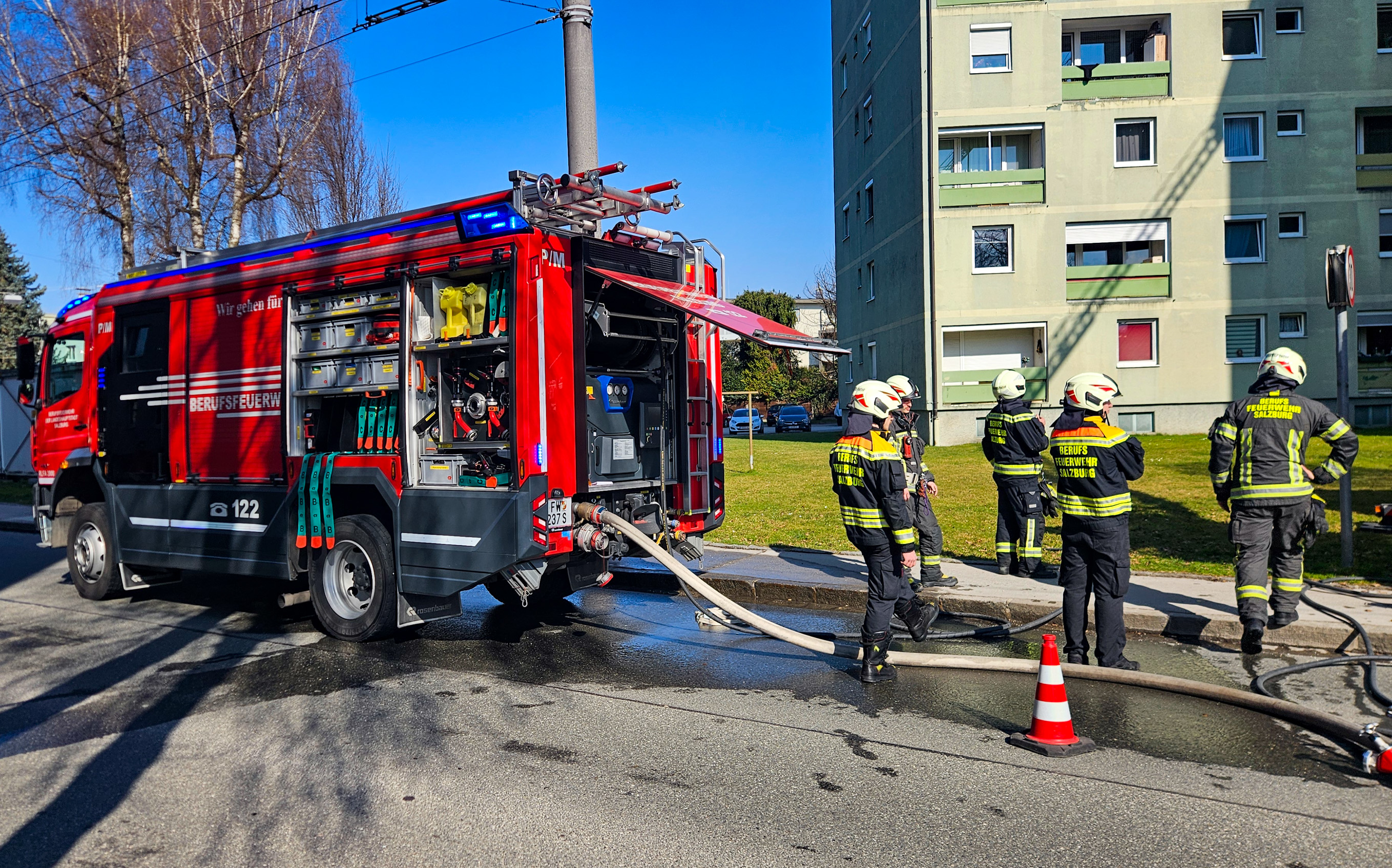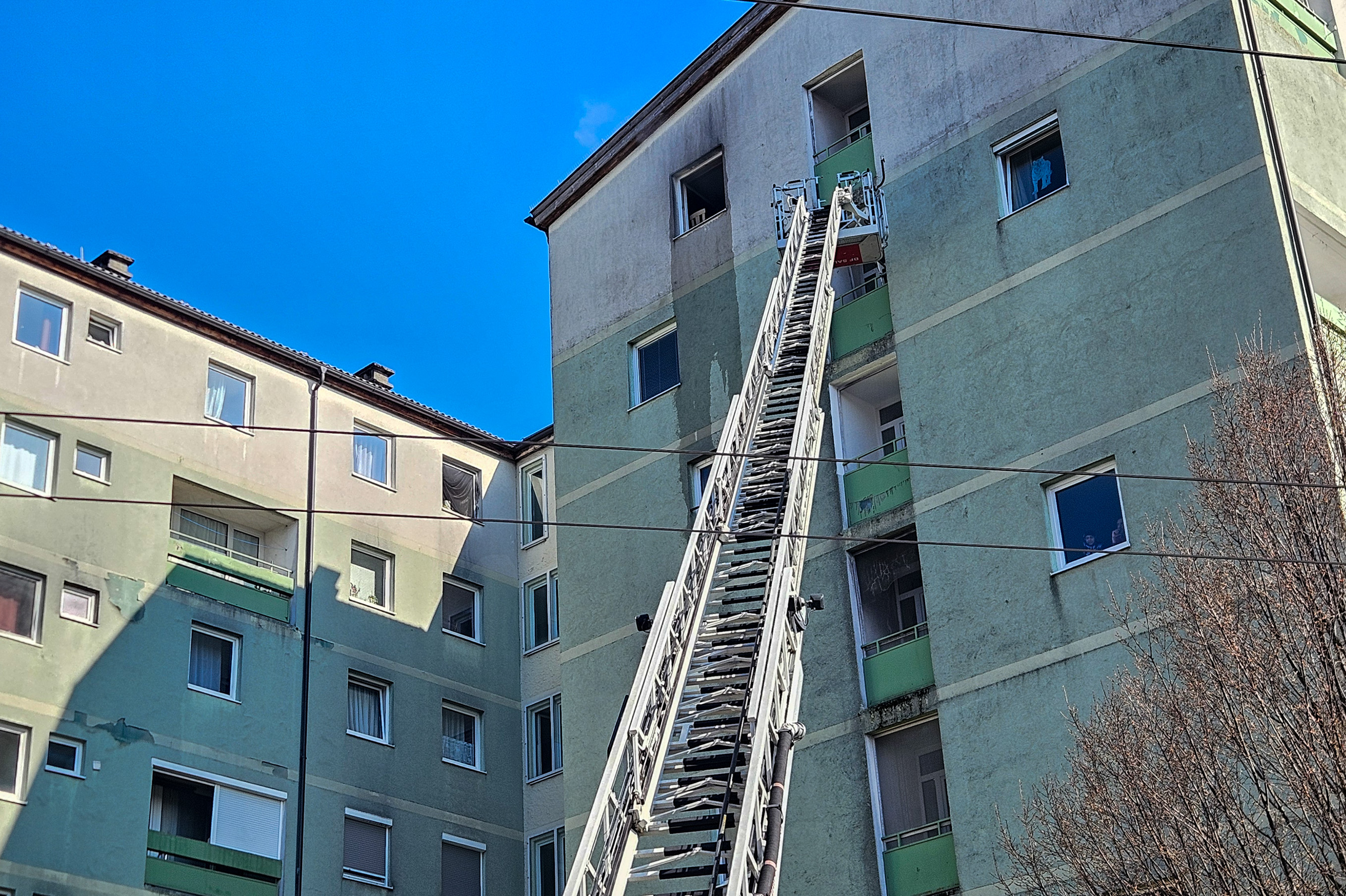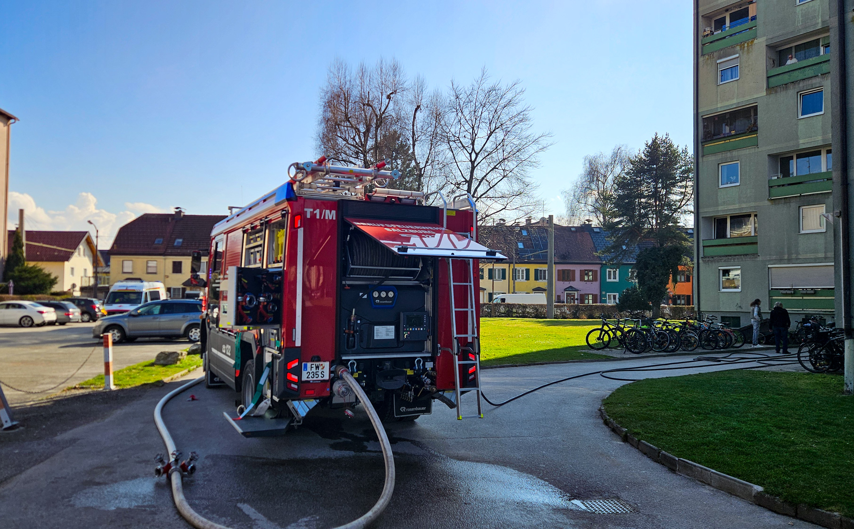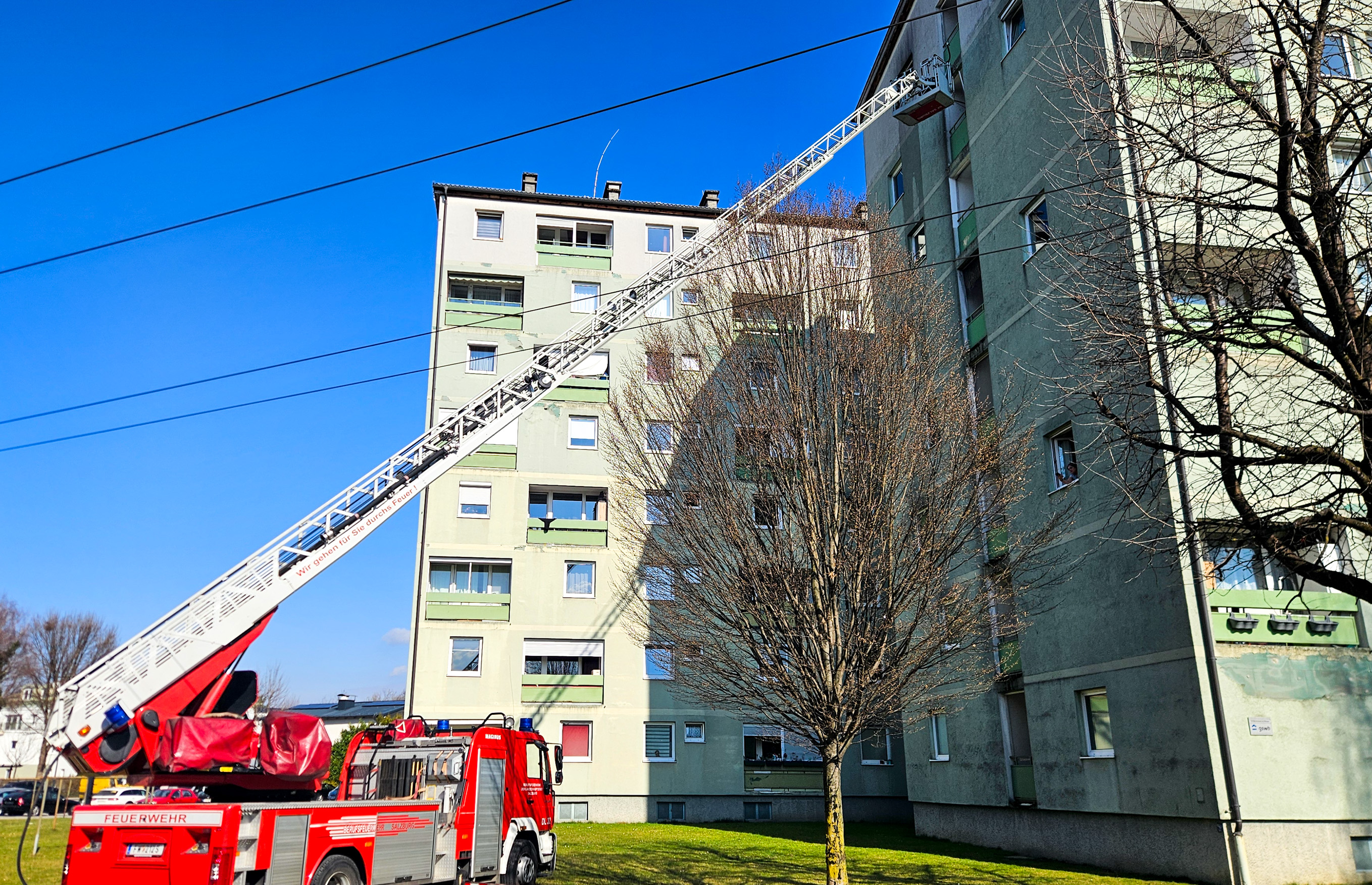 Zu einem Zimmerbrand kam es am frühen Dienstagnachmittag in der Bessarabier-Straße. Die Berufsfeuerwehr Salzburg zusammen lit dem Löschzug Liefering der FF Salzburg Stadt barg 2 Personen aus der Brandwohnung und löschte anschließend den Brand. Zwei Personen werden zur Zeit vom Roten Kreuz Salzburg reanimiert.