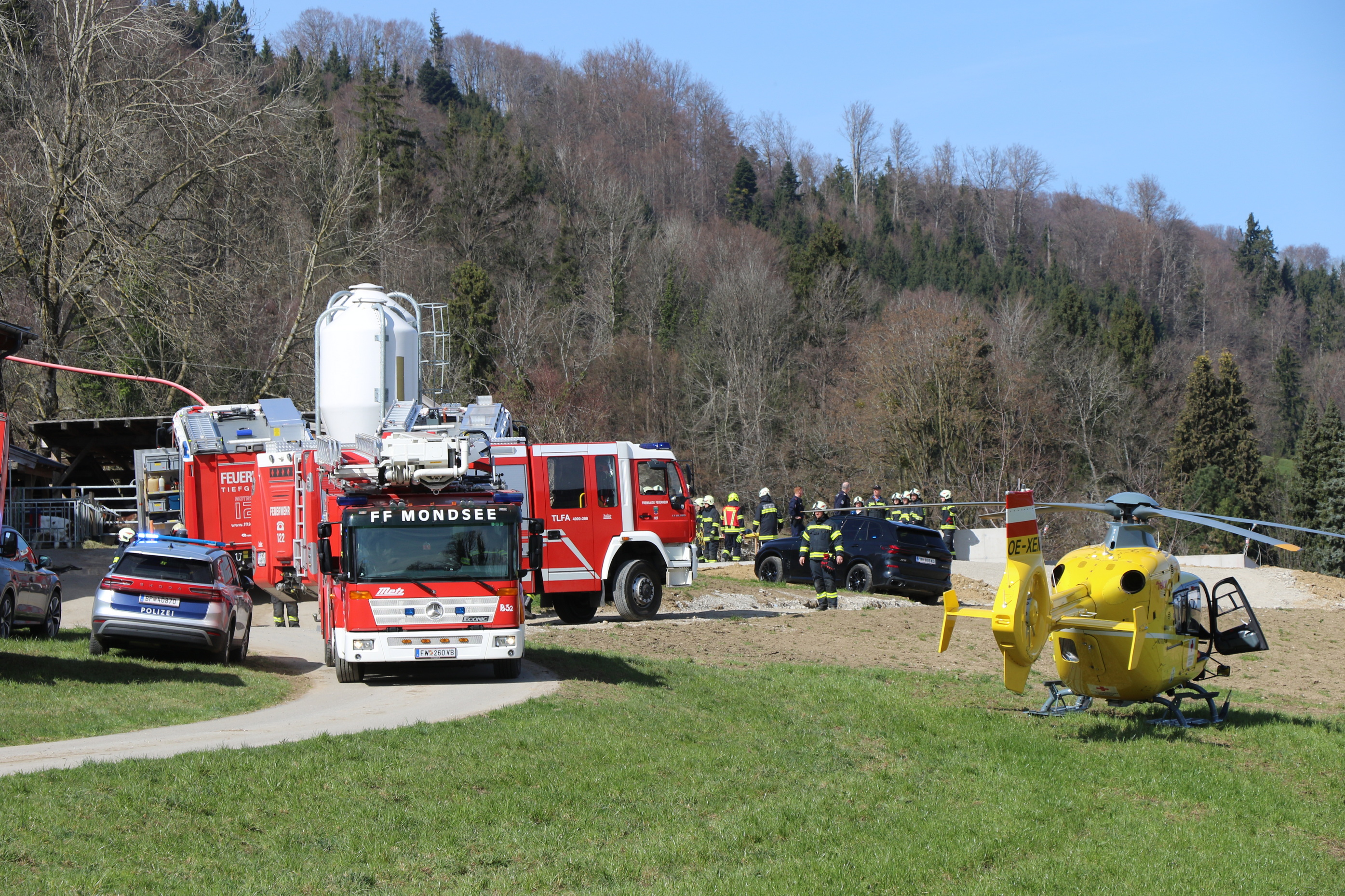 Am Samstagmittag kam es auf einem Bauernhof in Tiefgraben, in der Nähe des Irrsees, zu einem schweren Arbeitsunfall. Eine männliche Person stürzte aus bislang unbekannter Ursache in eine noch im Bau befindliche Güllegrube und zog sich dabei schwere Kopfverletzungen zu.