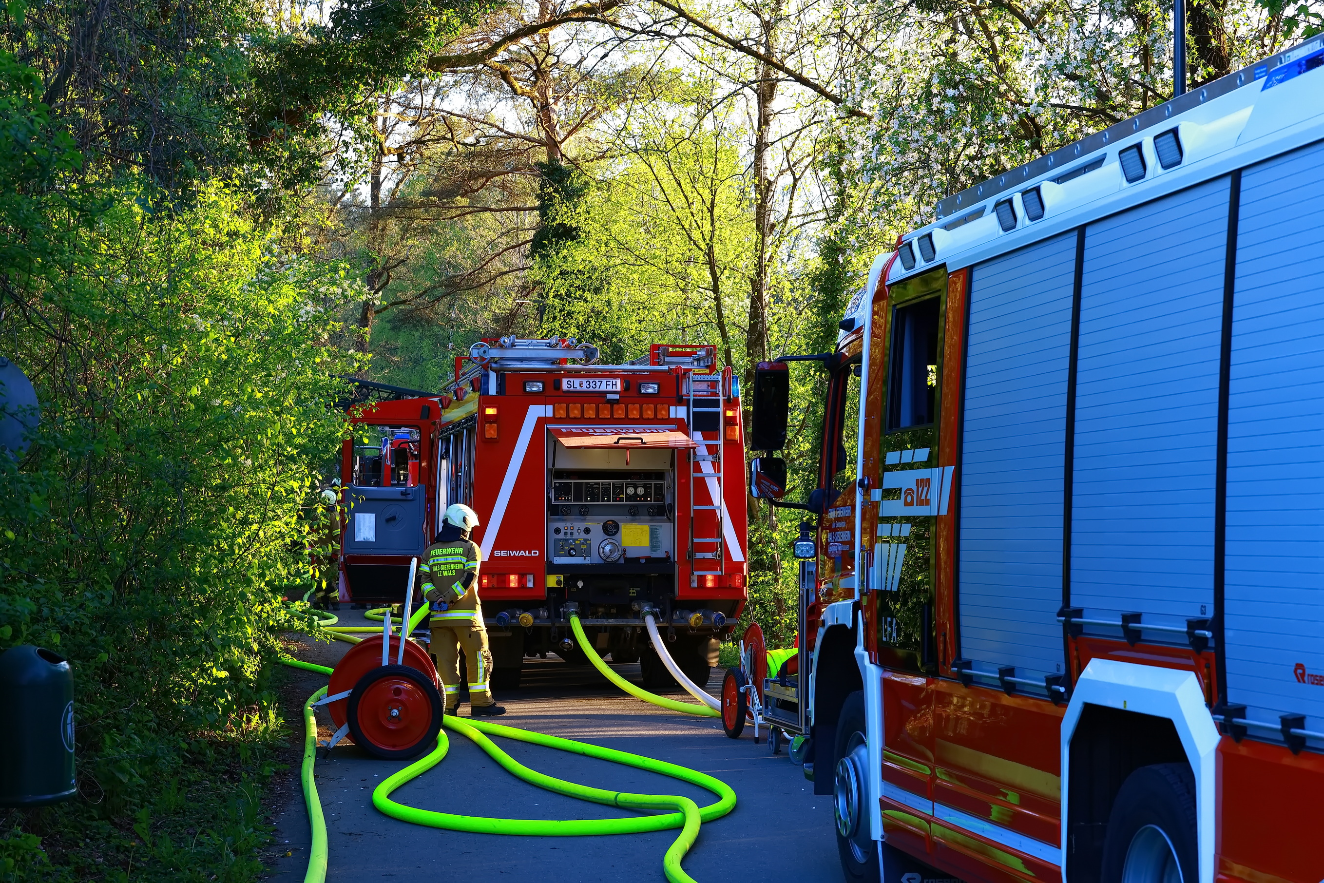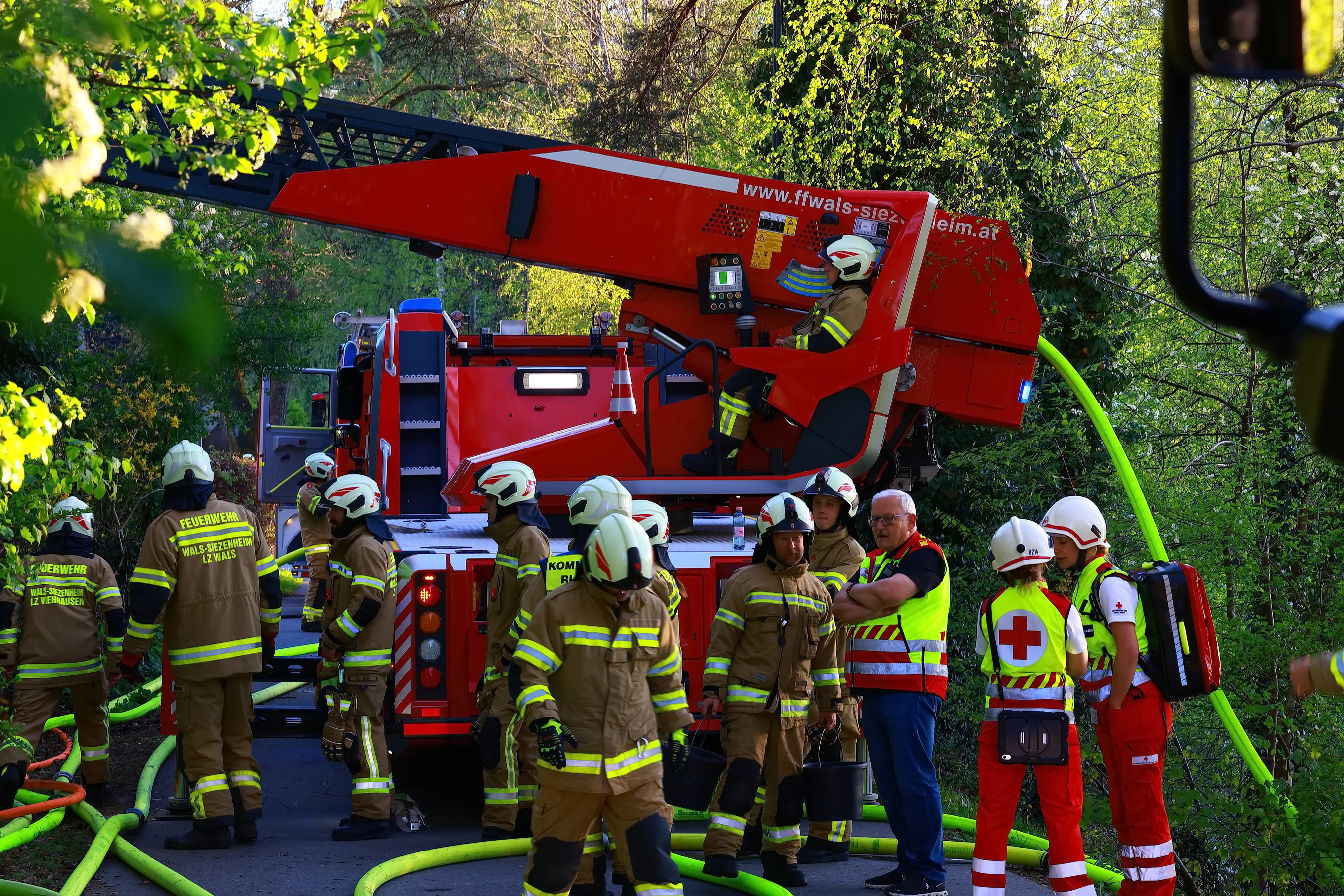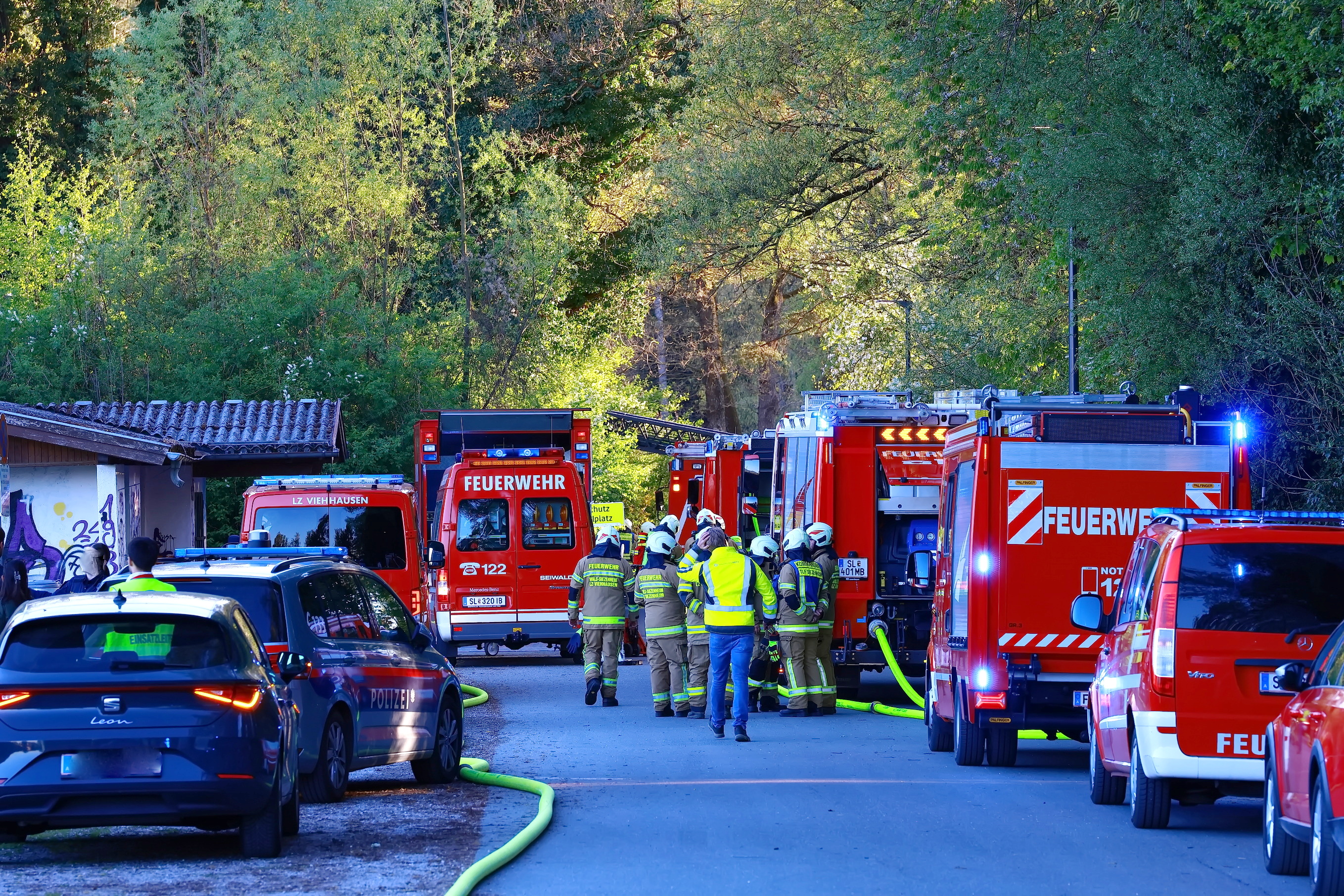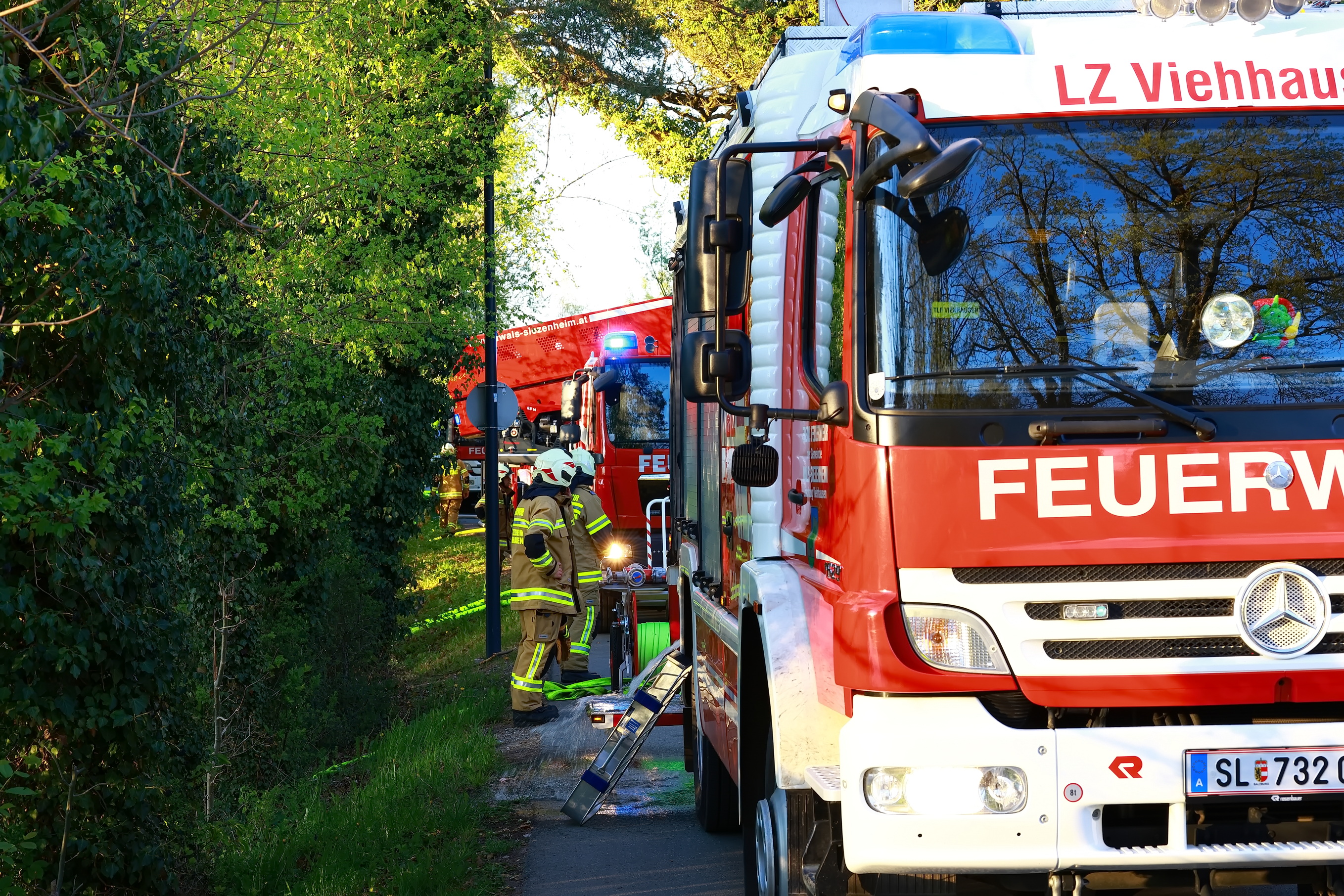 Zu einem Hausbrand wurde die Feuerwehr Viehausen gegen 18:45 Uhr in die Uferstrasse alarmiert. Mit 90 Mann und 12 Fahrzeugen waren die Feuerwehren Viehausen, Wals und Siezenheim vor Ort. Dass Rote Kreuz war mit 8 Mann und 4 Fahrzeugen ebenfalls vor Ort. Der Brand konnte nur schwer erreicht werden, da das Gebäude schon länger unbewohnt und dementsprechend das Gelände verwachsen ist. Das Haus wird auch von den Anwohnern mittlerweile als Geisterhaus bezeichnet.