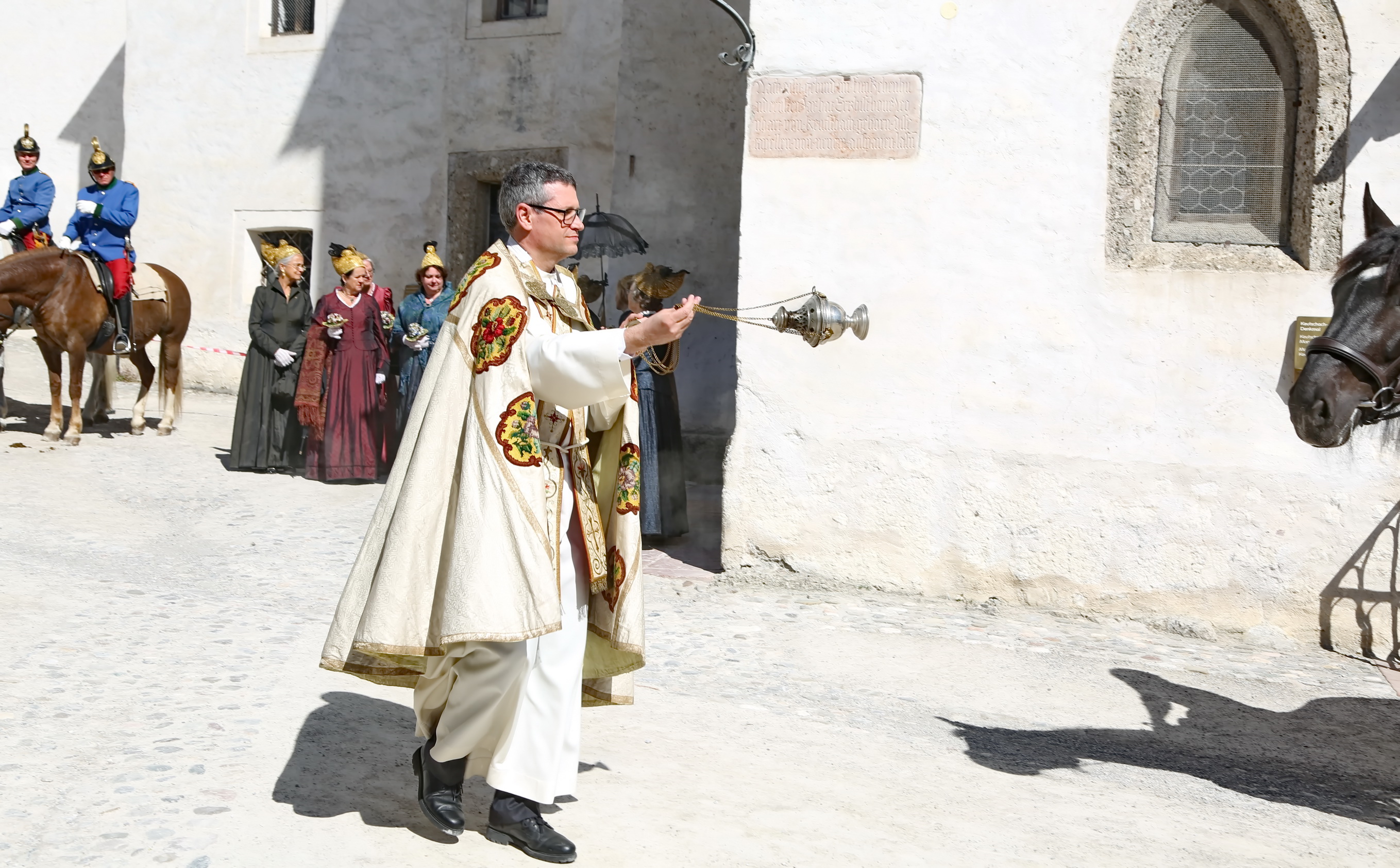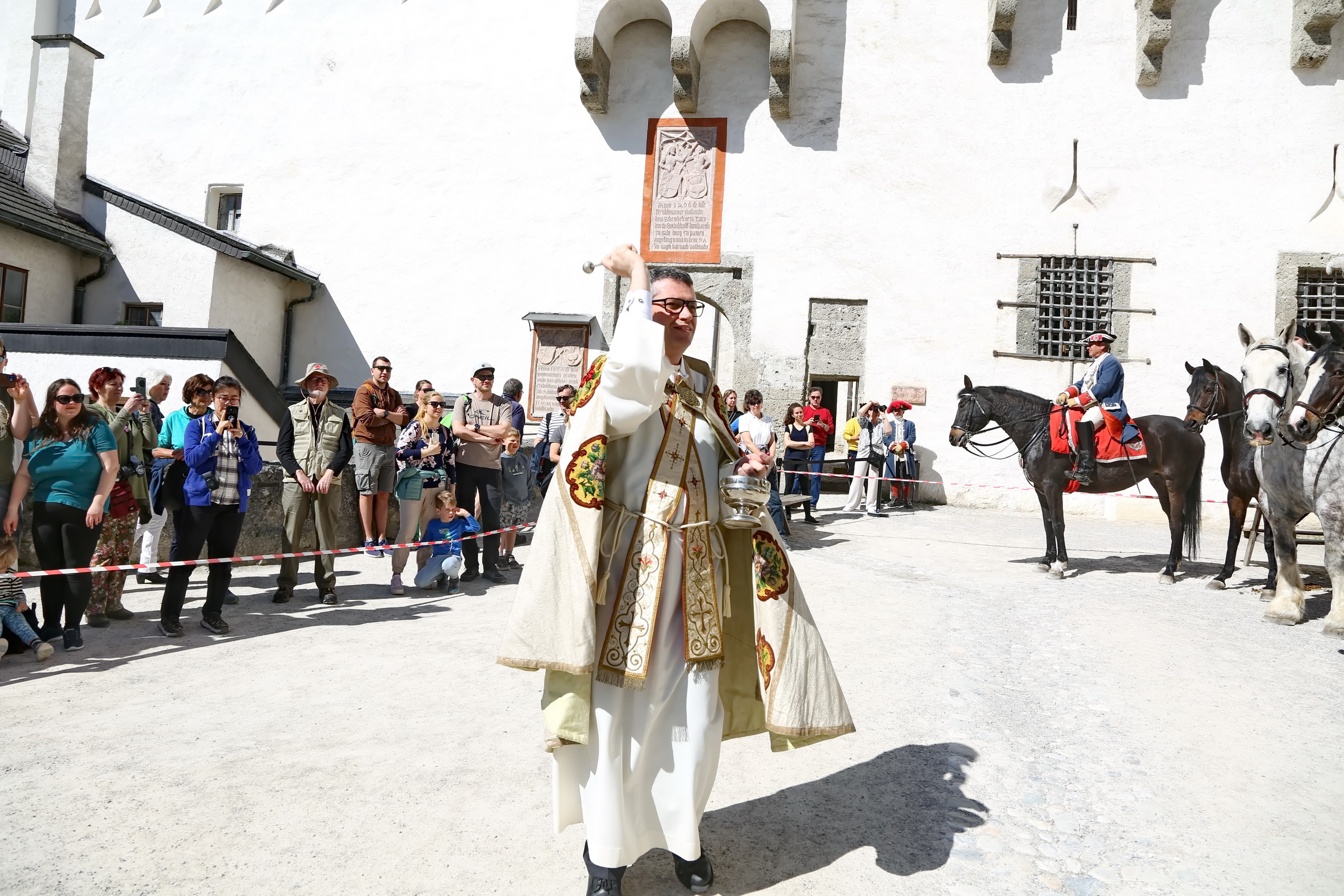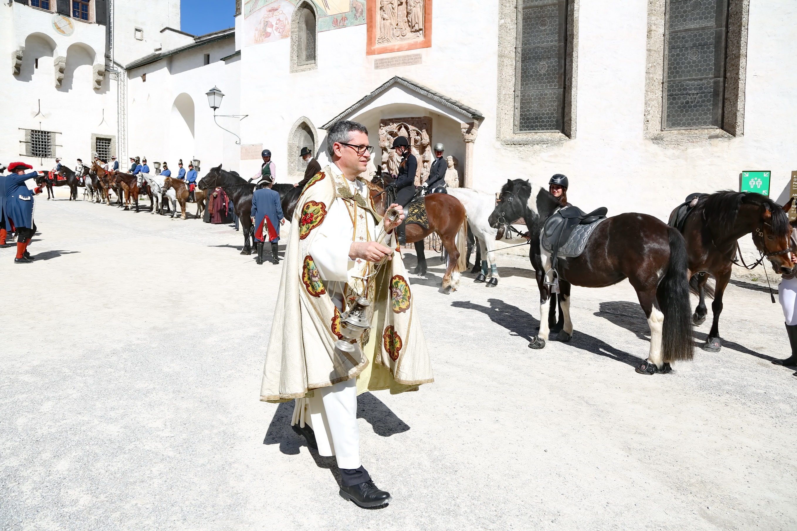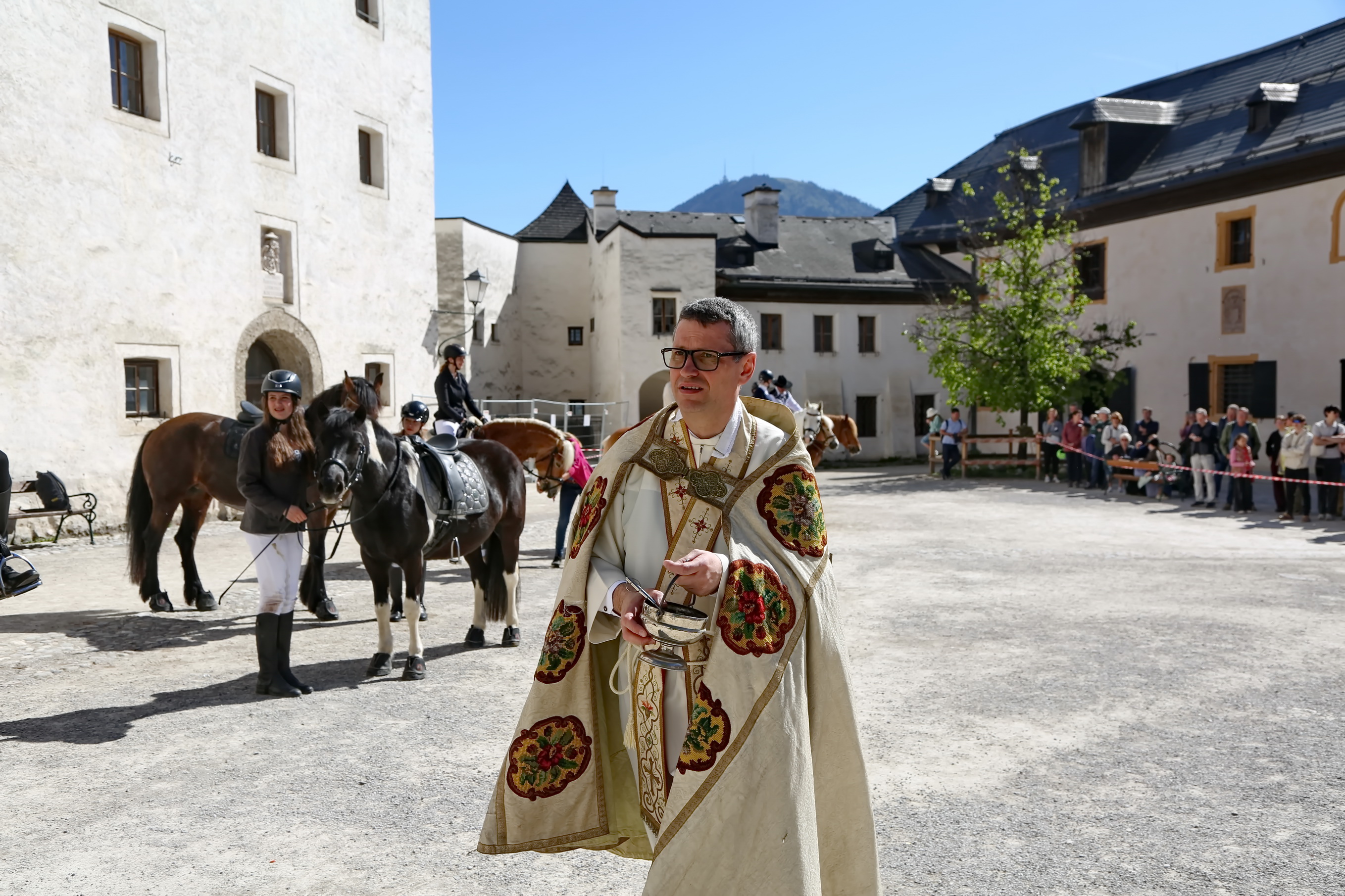Ca. 10:30 Uhr: Pferdesegnung im Großen Burghof Den spirituellen Höhepunkt bildete die feierliche Pferdesegnung im Großen Burghof der Festung. Hier kamen Reiter, Ehrengäste und Besucher zusammen, um die Zeremonie unter freiem Himmel zu begleiten.