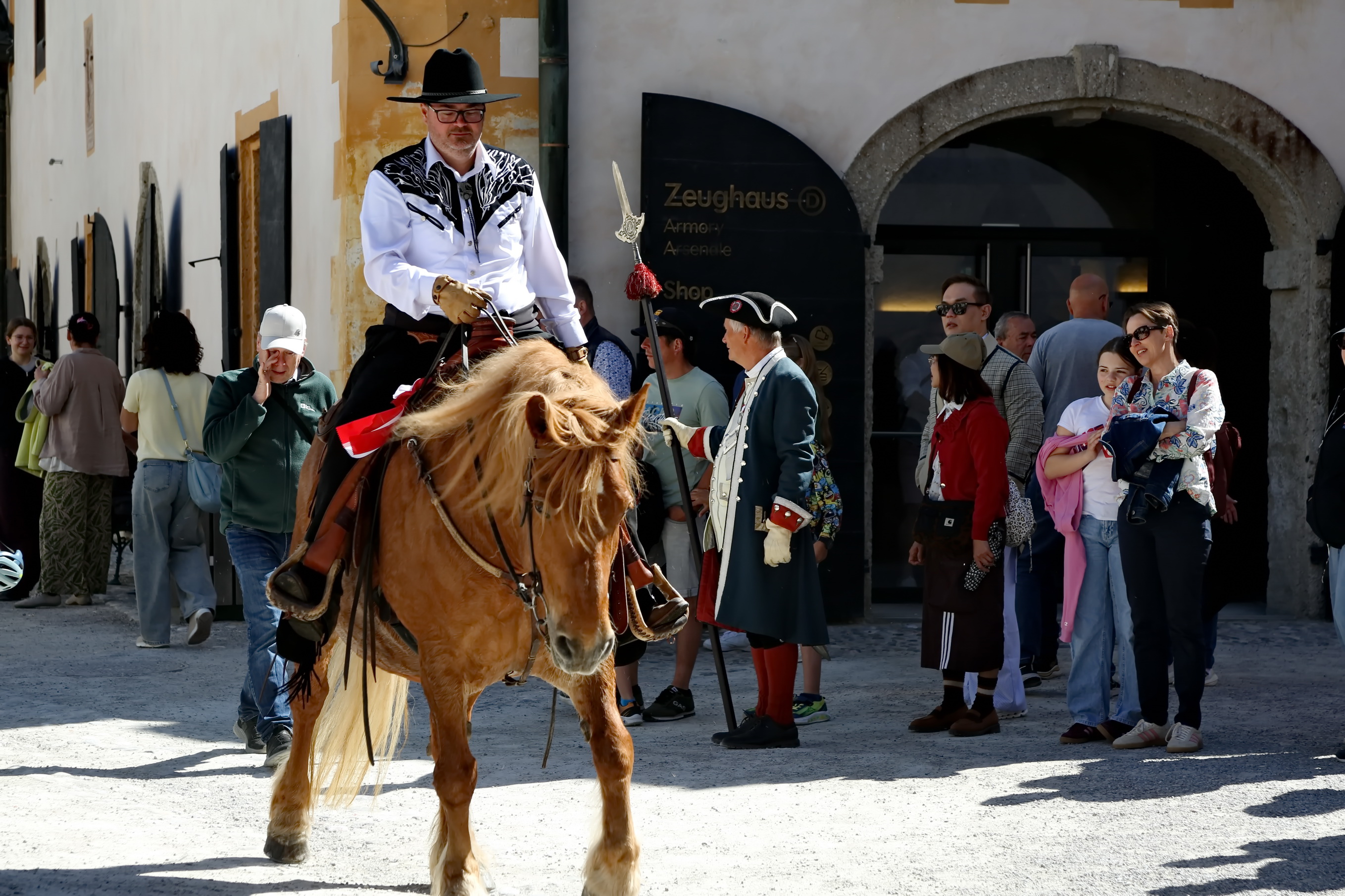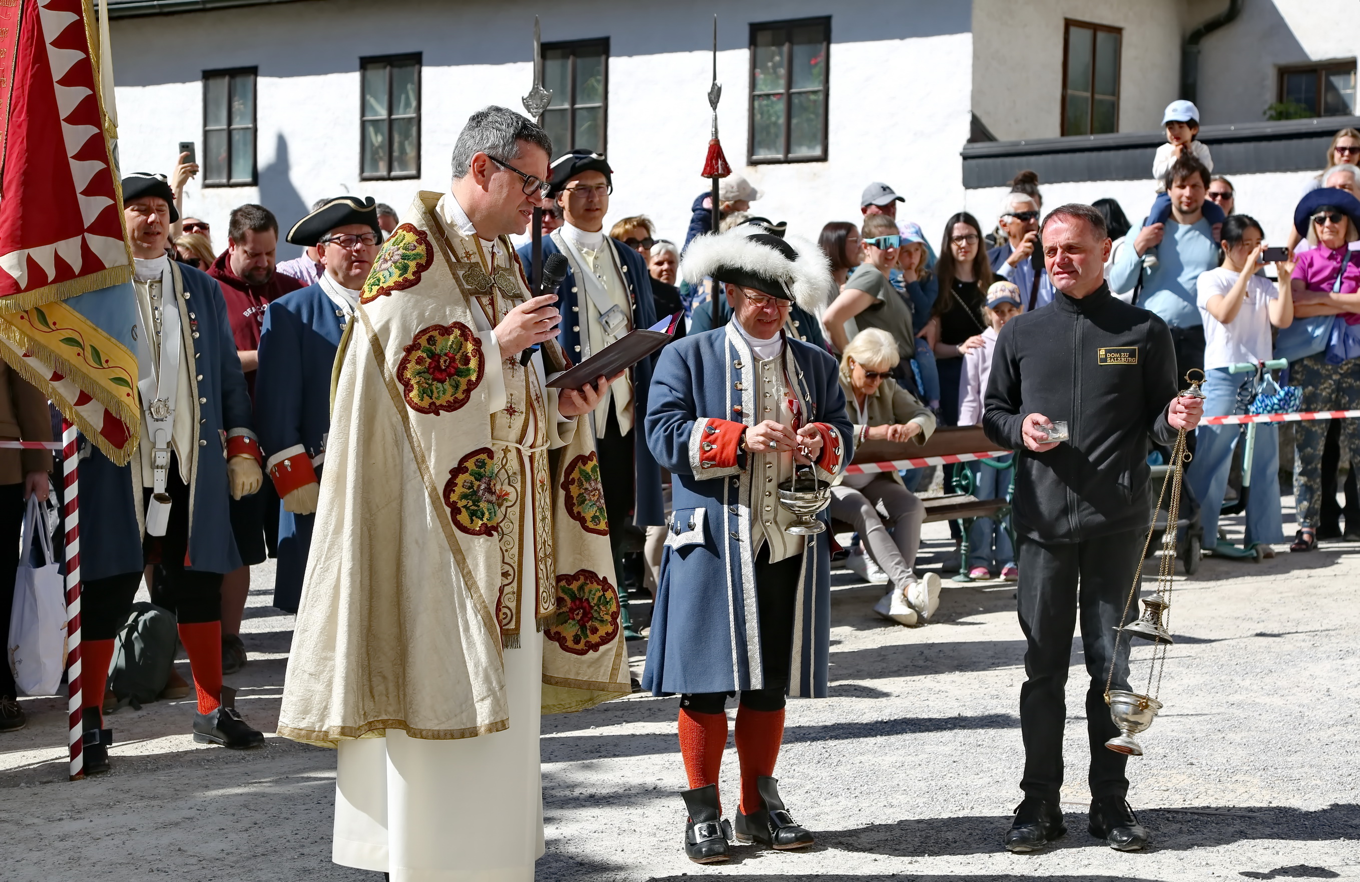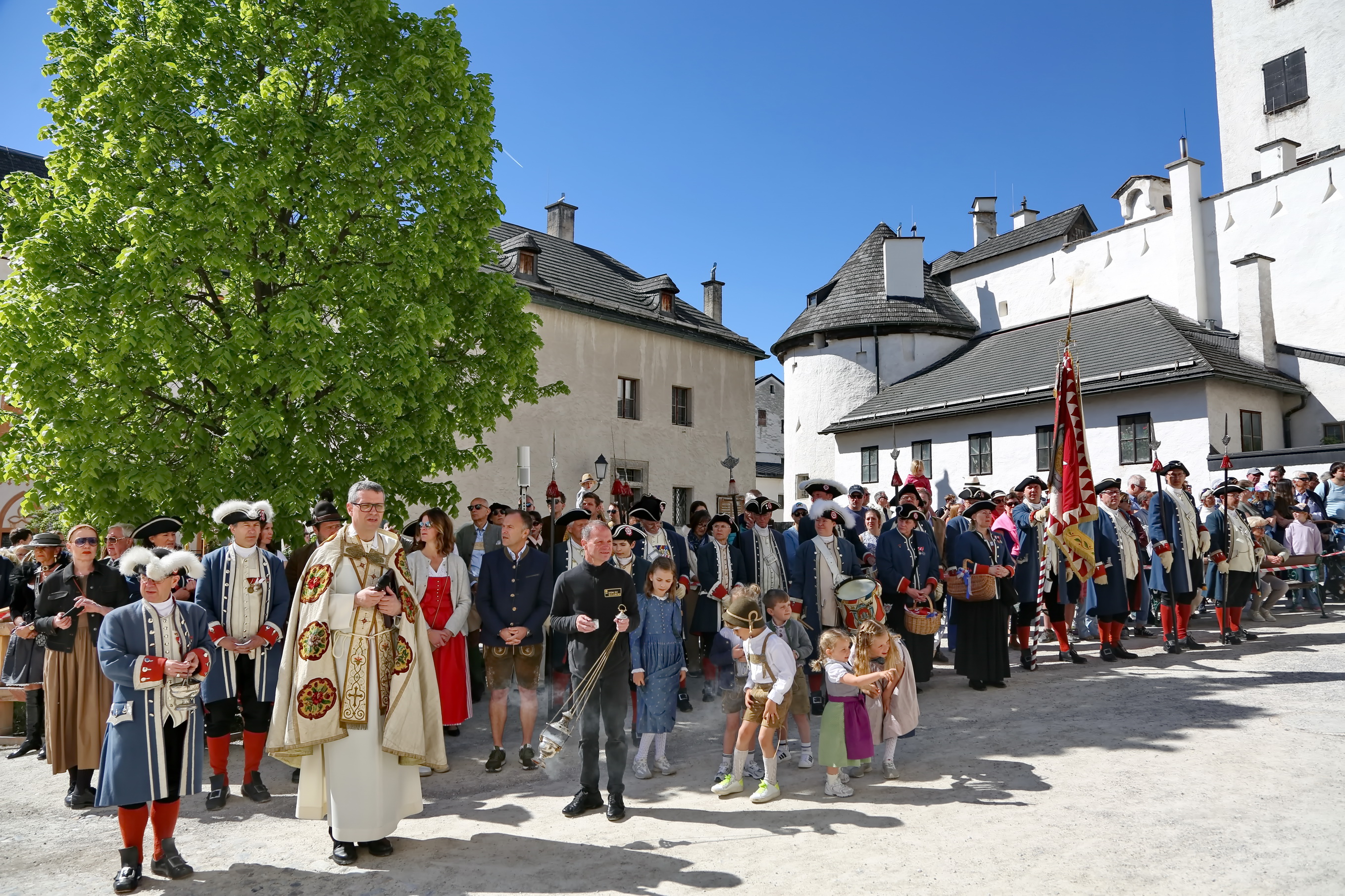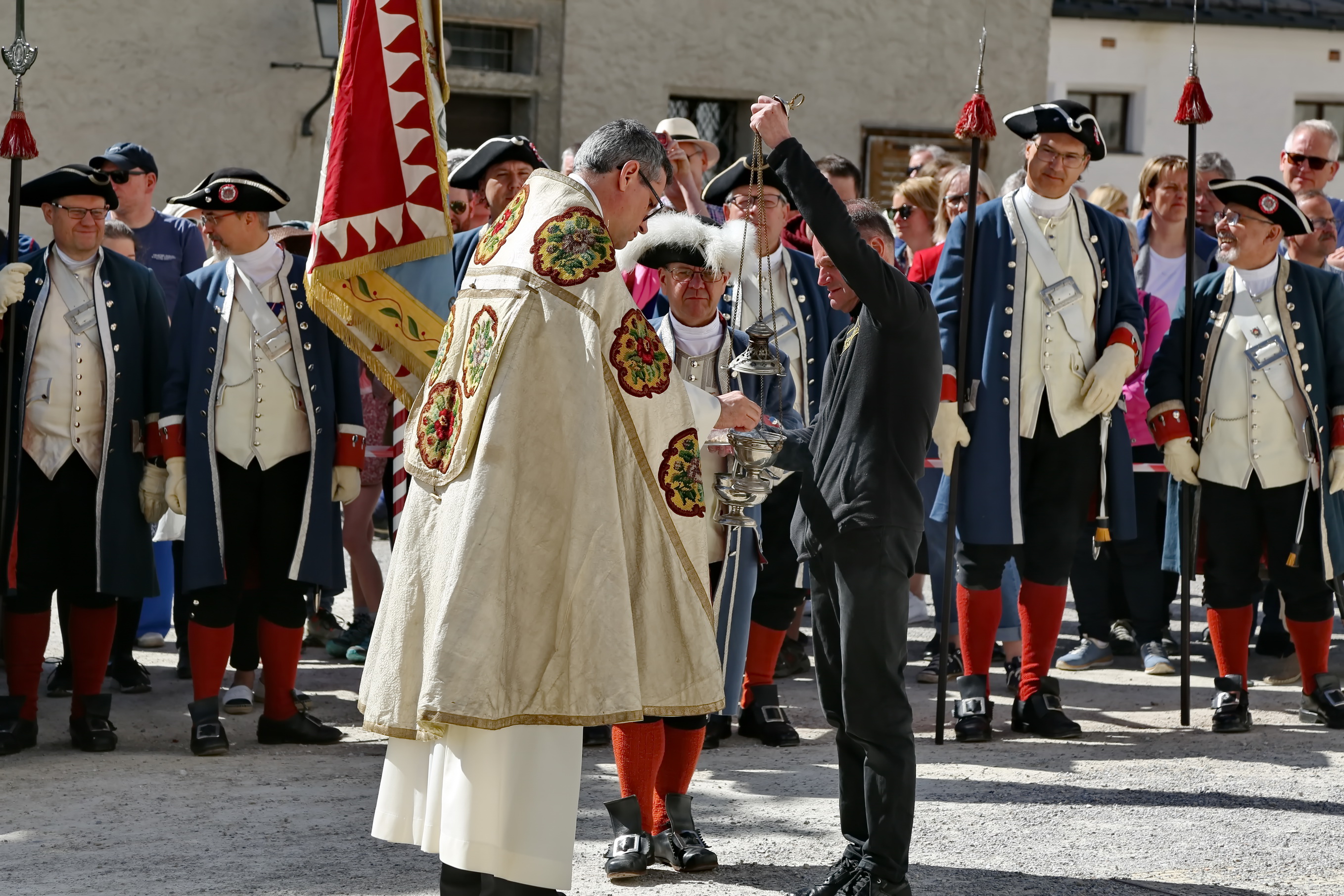 Ca. 10:30 Uhr: Pferdesegnung im Großen Burghof Den spirituellen Höhepunkt bildete die feierliche Pferdesegnung im Großen Burghof der Festung. Hier kamen Reiter, Ehrengäste und Besucher zusammen, um die Zeremonie unter freiem Himmel zu begleiten.