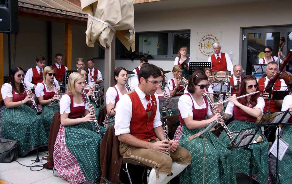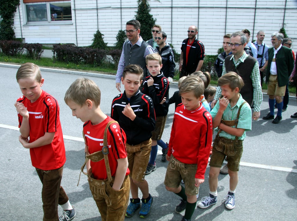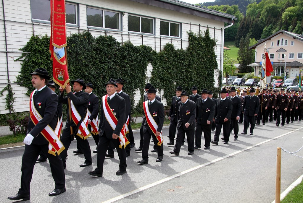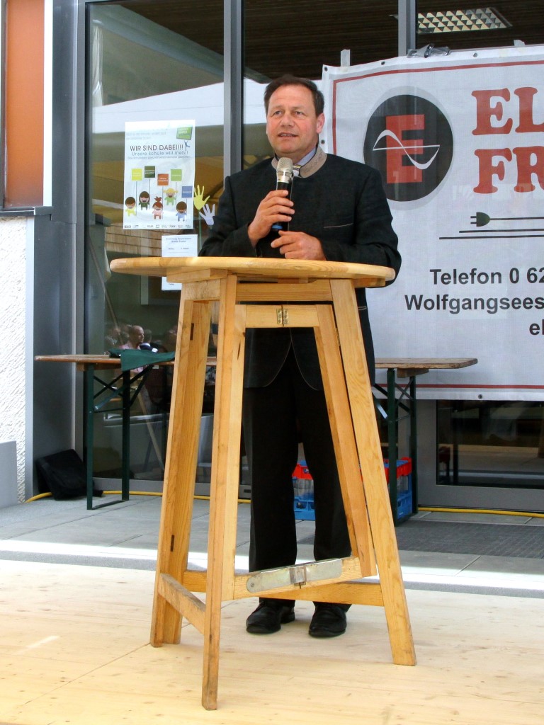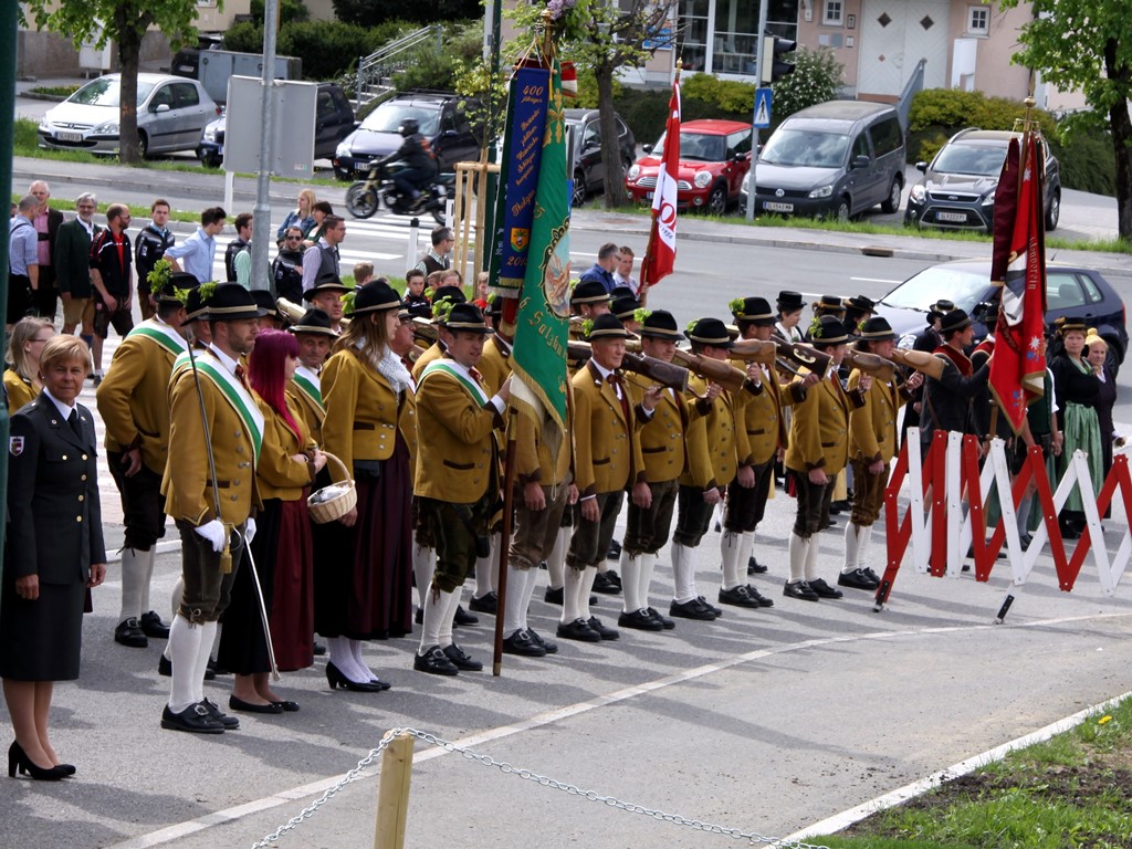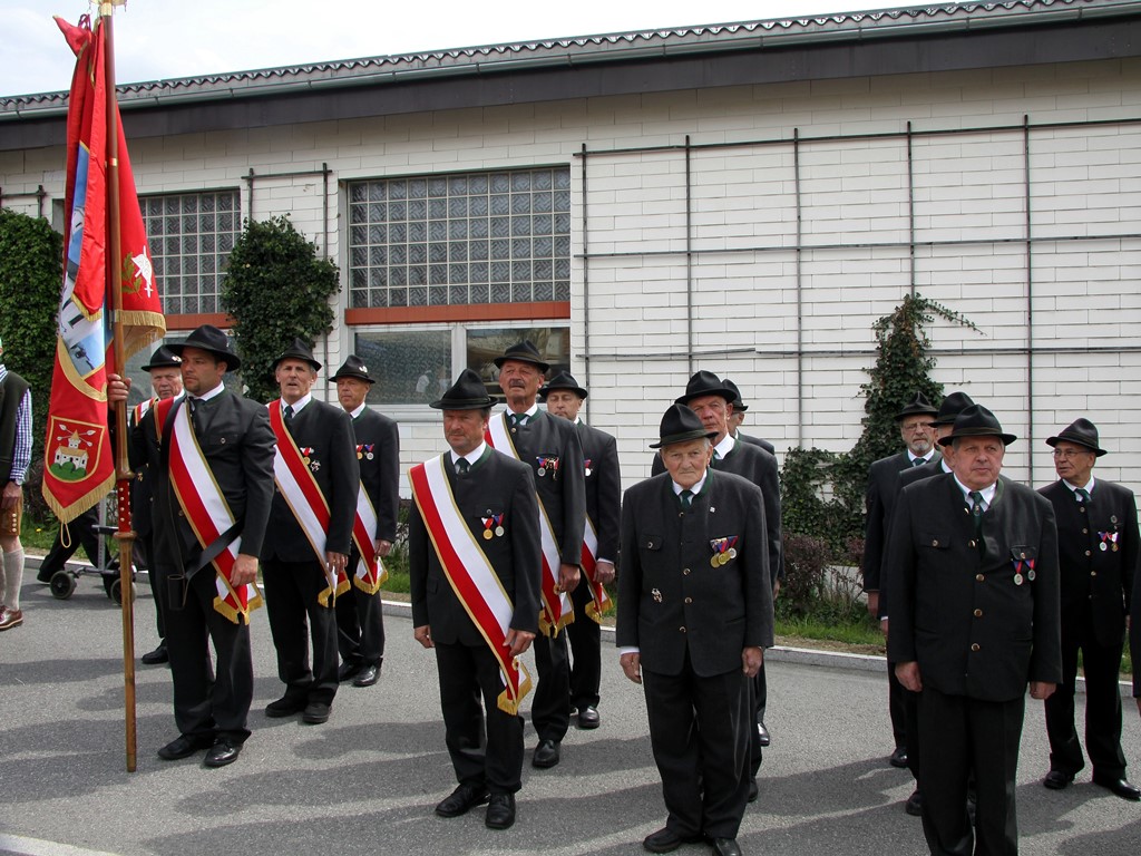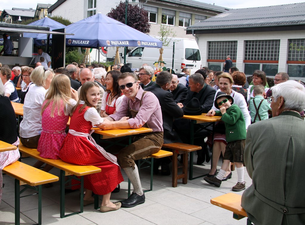 Nach dem Kirchgang marschierten Vereine, Gemeindevertretung mit Pfarrer Josef Sams, Rettung, die Bürgerfrauen sowie das Gemeindevolk von der Kirche zum neuen Platz vor der Gemeinde, bzw. der Volksschule. Der Platz wurde im letzten Jahr neu gestaltet und der Brunnen (Namensgeber für den Platz) versetzt. Dadurch konnte man mehr freie Fläche für diverse Veranstaltungen erreichen. Der Tourismusverband spendete die riesigen Schirme, die bei zukünftigen Festen etc. am Großteil des Platzes die Besucher vor Sonne oder Regen schützen werden.
