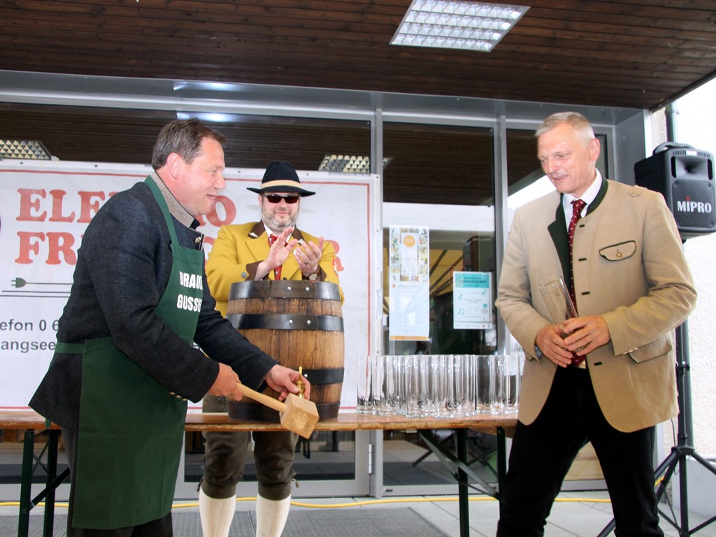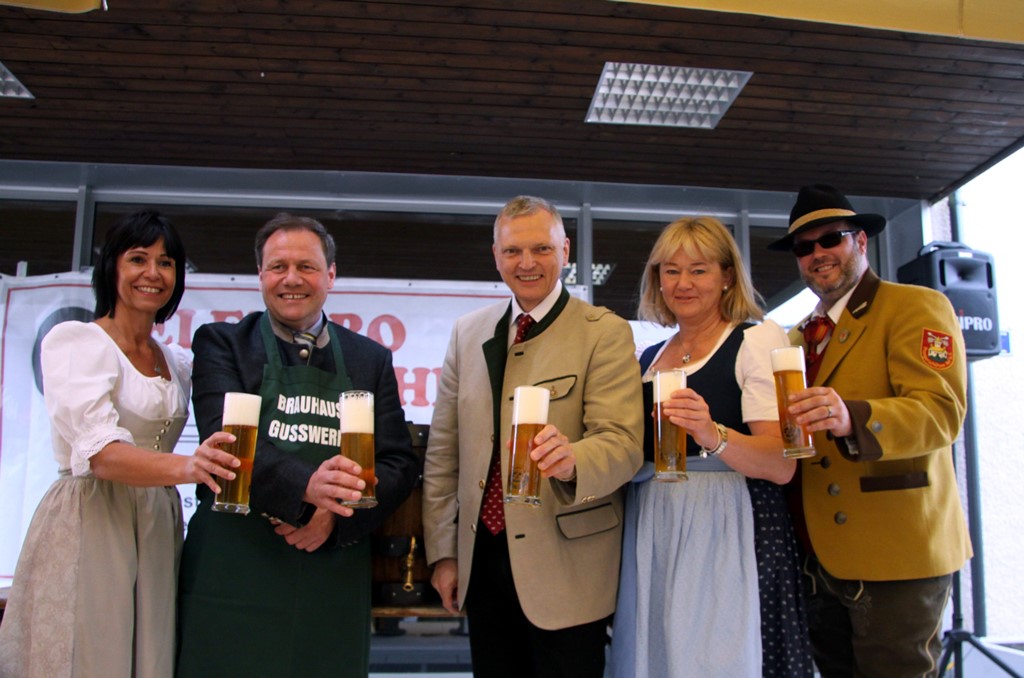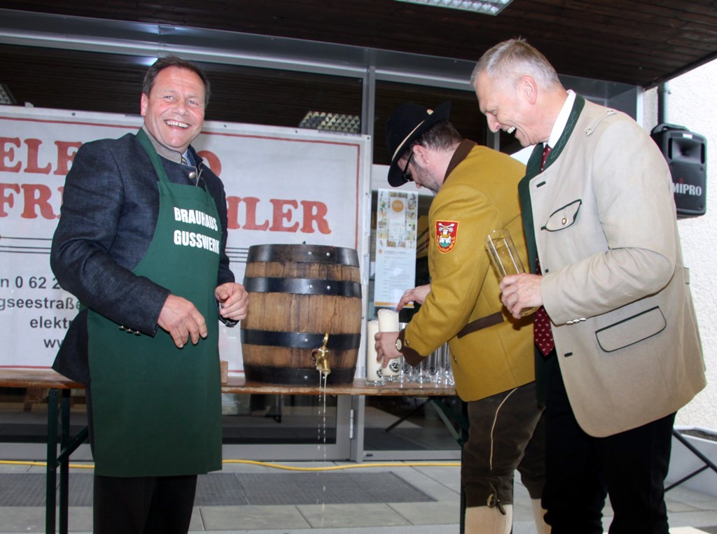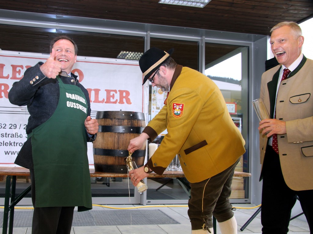 Schlussendlich kam man zum letzten Teil des offiziellen Programmes der Brunnenplatzeinweihung und zwar zum Bieranstich. Das Faß wurde unter Beihilfe von Dr. Josef Schöchl und GUSSWERK-Inhaber Reinhold Barta von Bürgermeister Liess angeschlagen. Ohne jedes Spritzen landete die erste Halbe im Glas. Weitere Gläser wurden ausgeteilt und nach einem gemeinsamen Foto mischte man sich unters Volk und genoss die von den "Schworzmüh-Teifin“ angebotenen Köstlichkeiten.