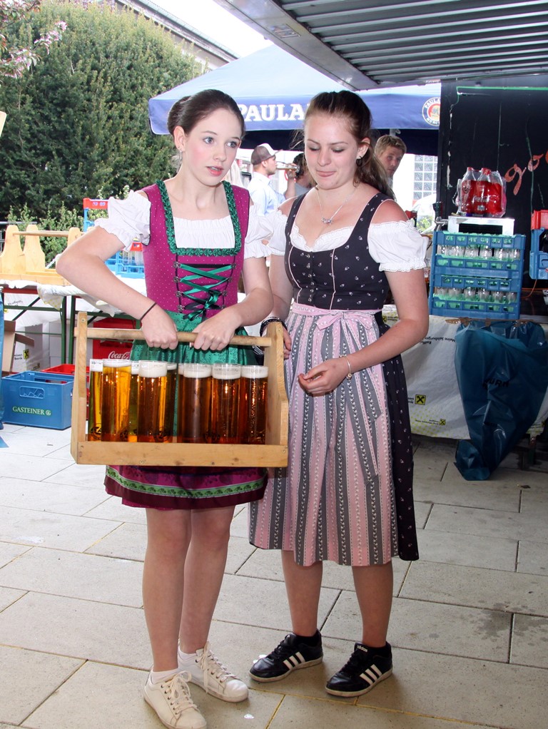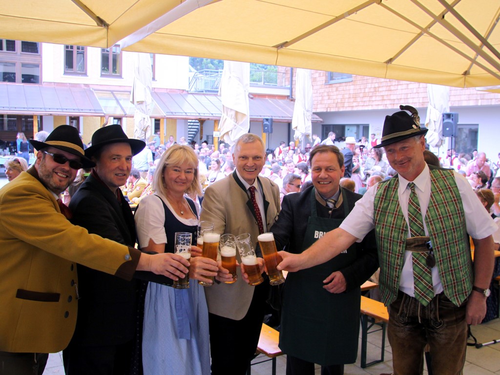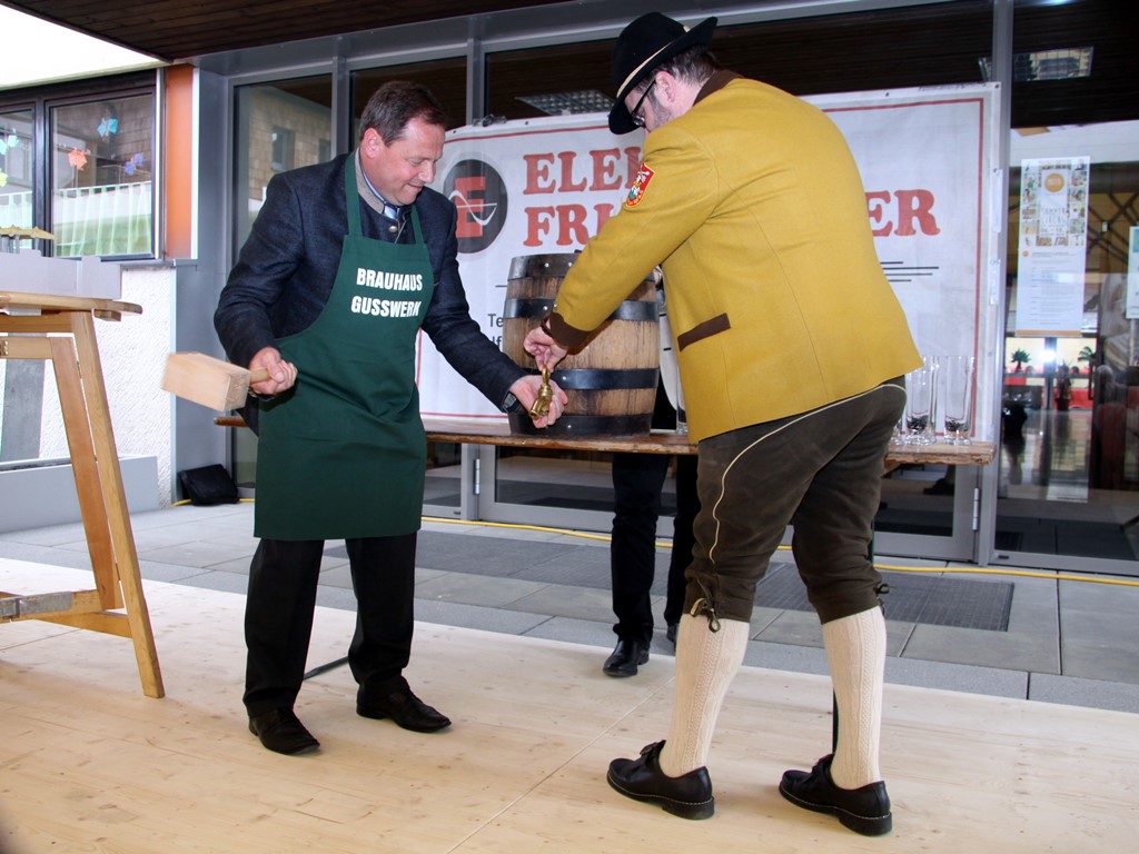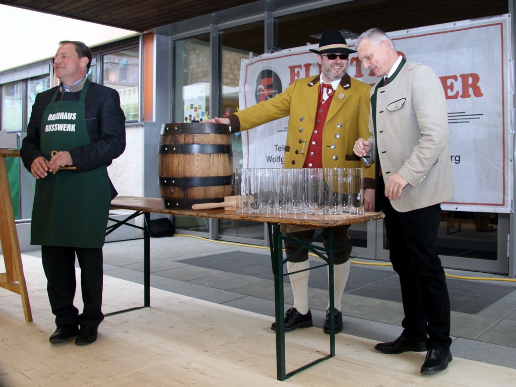 Schlussendlich kam man zum letzten Teil des offiziellen Programmes der Brunnenplatzeinweihung und zwar zum Bieranstich. Das Faß wurde unter Beihilfe von Dr. Josef Schöchl und GUSSWERK-Inhaber Reinhold Barta von Bürgermeister Liess angeschlagen. Ohne jedes Spritzen landete die erste Halbe im Glas. Weitere Gläser wurden ausgeteilt und nach einem gemeinsamen Foto mischte man sich unters Volk und genoss die von den "Schworzmüh-Teifin“ angebotenen Köstlichkeiten.